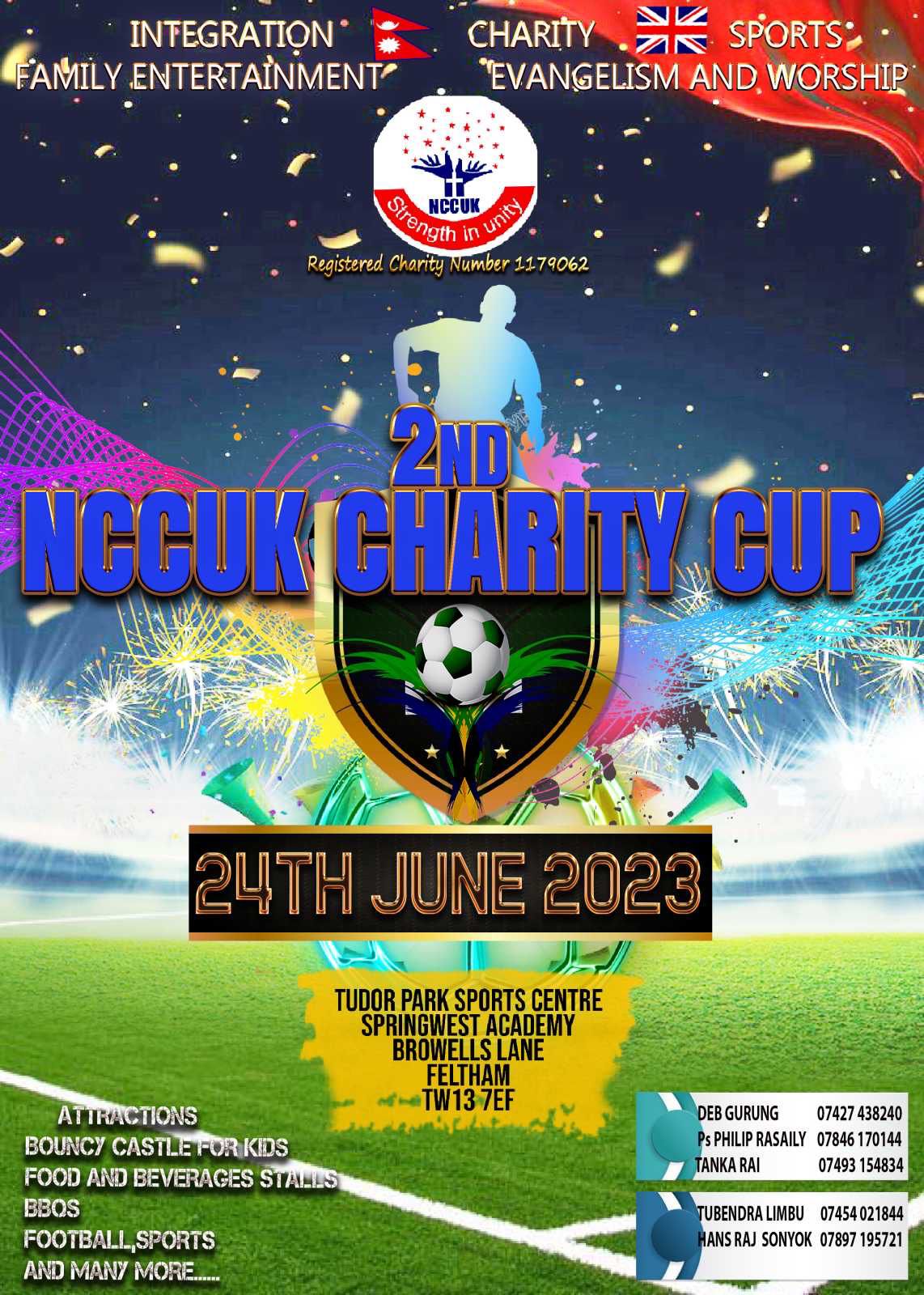 We are thrilled to extend an invitation to you for the 2nd NCCUK Charity Cup taking place on Saturday 24th June 2023. Our goal for this event is to bring integration among Nepali churches in the UK through a day of sports, family entertainment, evangelism, worship and charity.